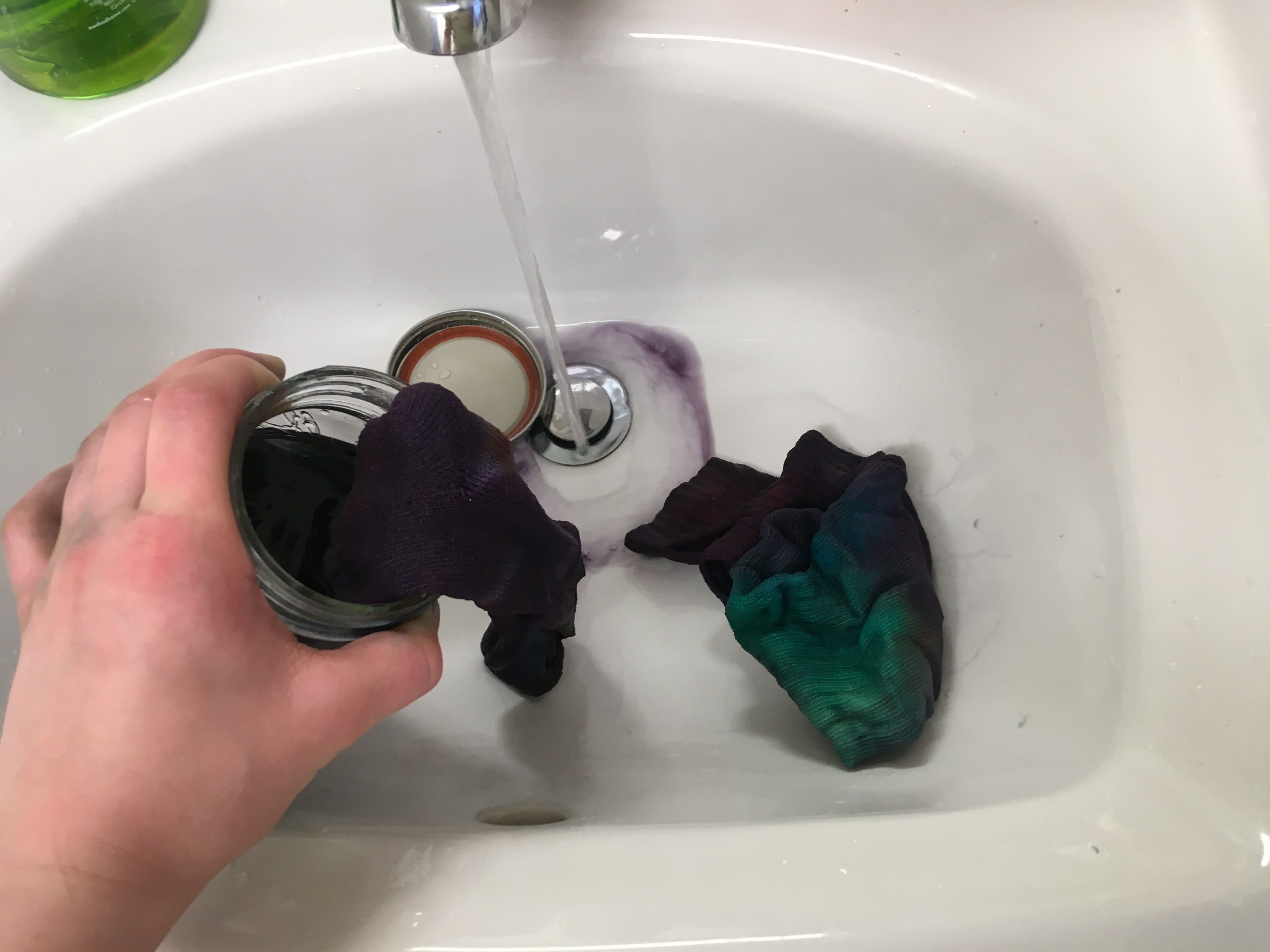 After soaking the socks in a bath of soda ash (soda ash acts as a mordant — a substance that helps the fabric retain the dye), we layered ice, powdered dye, and fabric into a glass jar until the entire pair of socks was in the jar. I carried the jar back to my dorm and when the ice melted, I rinsed out the socks.